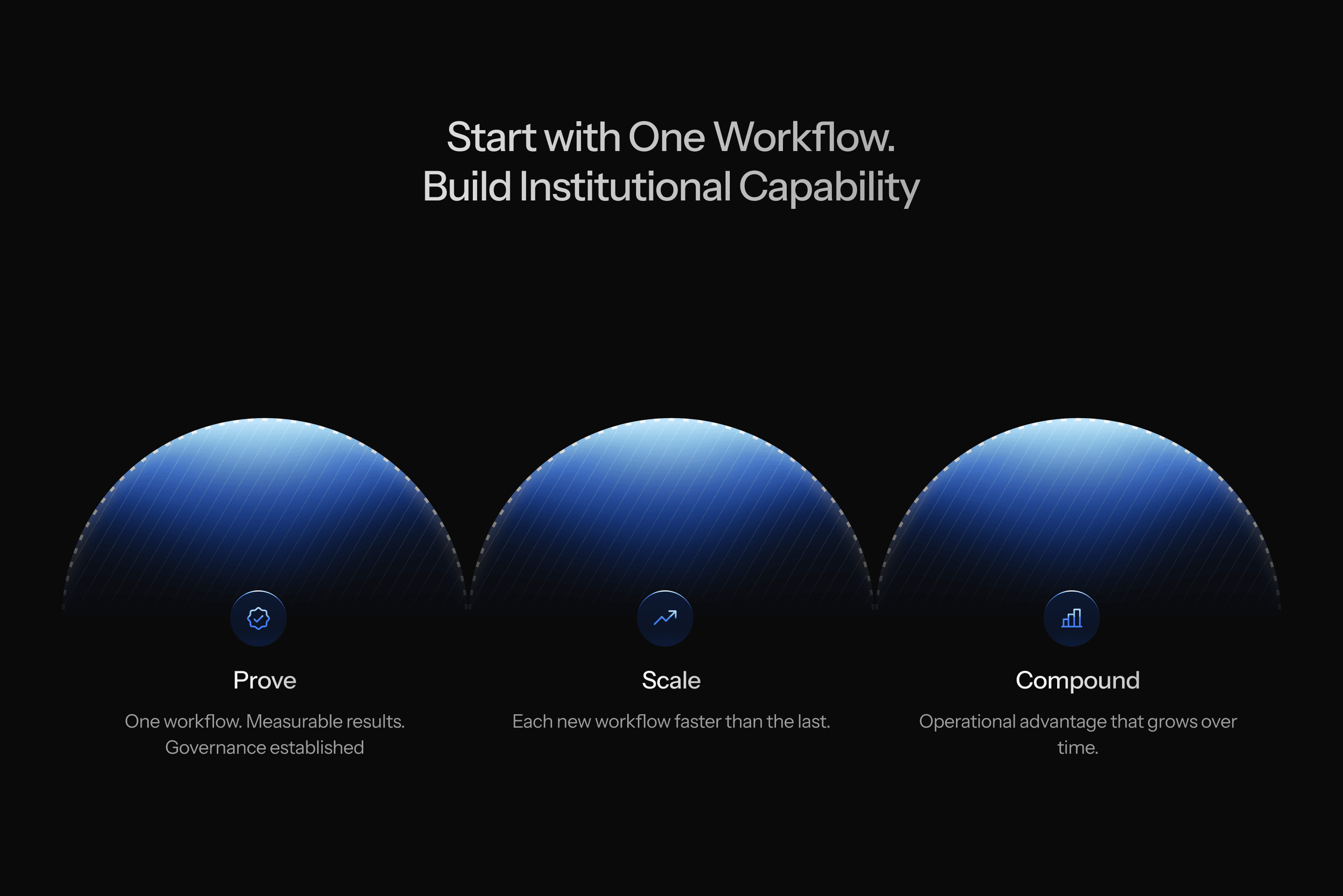 One of the more intentional design decisions: the Prove → Scale → Compound adoption path.
