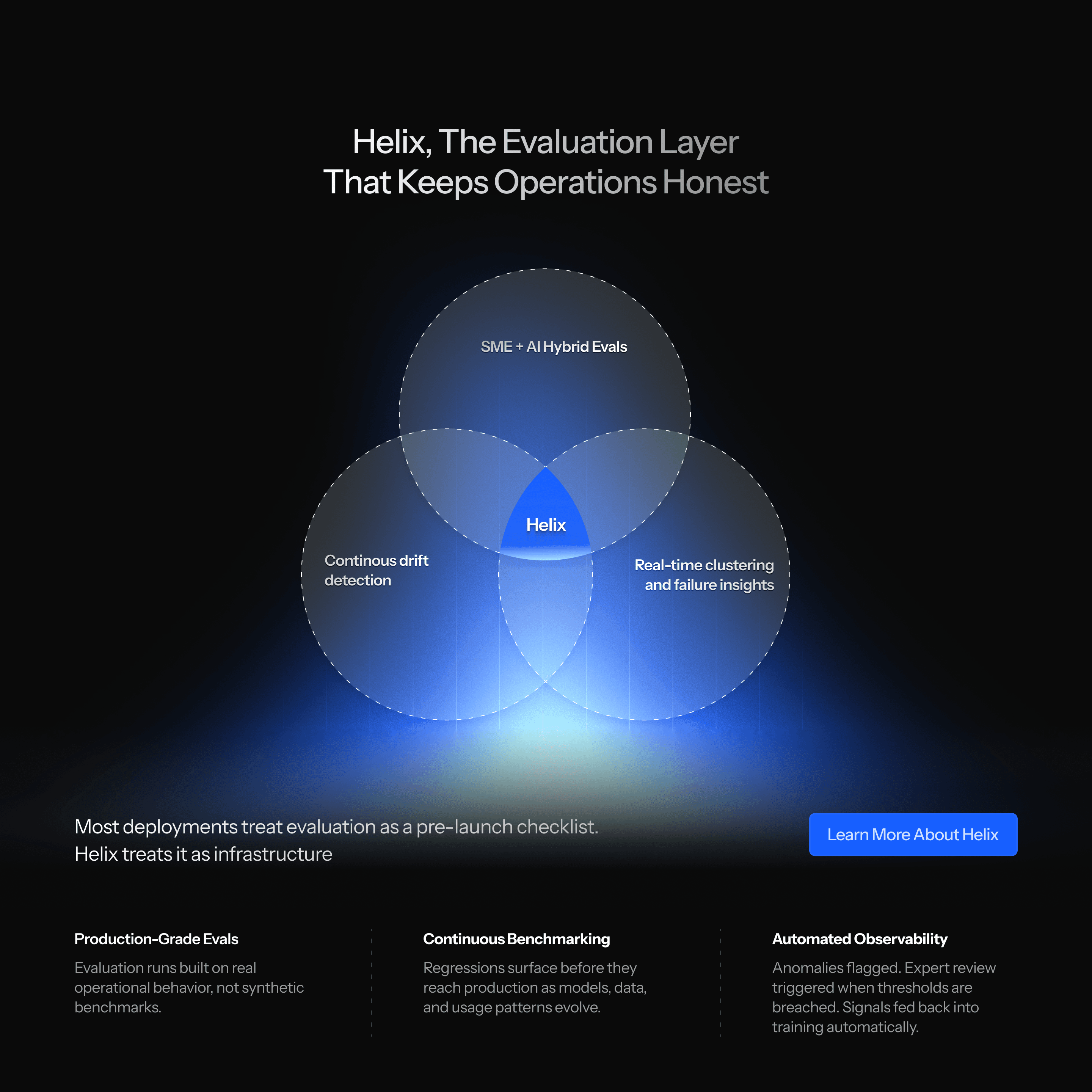 "Can I trust the outputs?" → Helix reliability layer with three capability cards