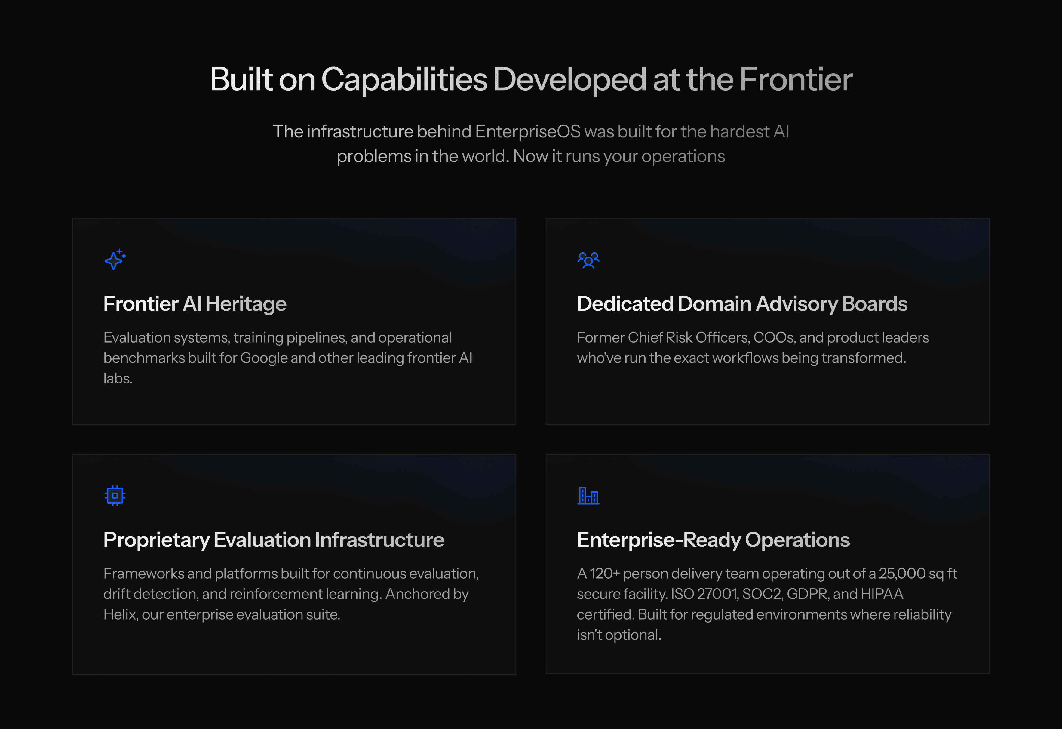 The Technical DNA section was the hardest to design well. Four capabilities — multi-model orchestration, evaluation infrastructure, governed decision systems, continuous learning — that could easily become a wall of text.