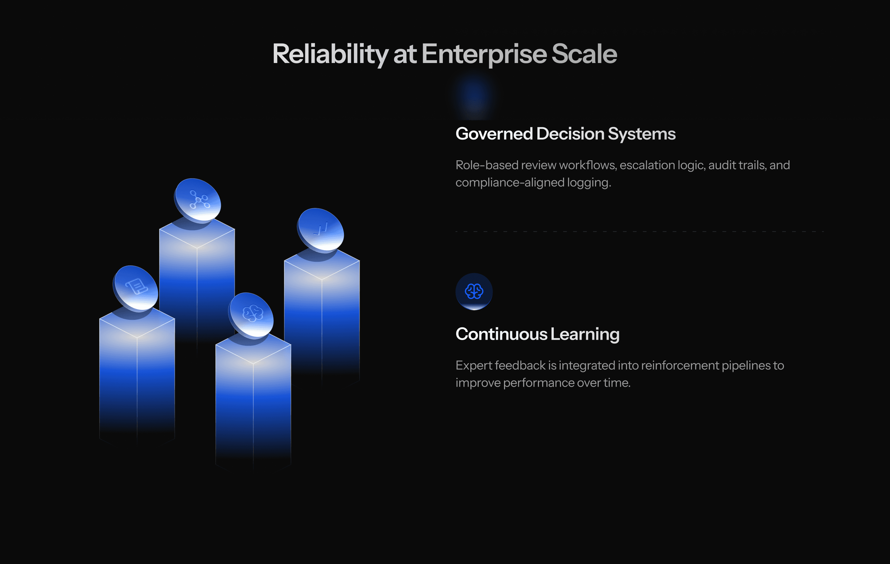 Technical depth without cognitive overload: Features like multi-model orchestration, evaluation infrastructure, and governed decision systems needed to be explained visually — not buried in paragraphs.